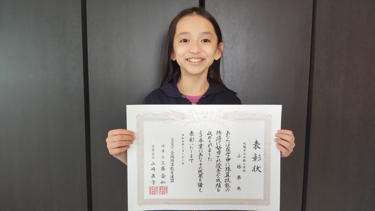 小学校卒業にあたり全国珠算教育連盟から珠算技能優秀表彰を受けました。